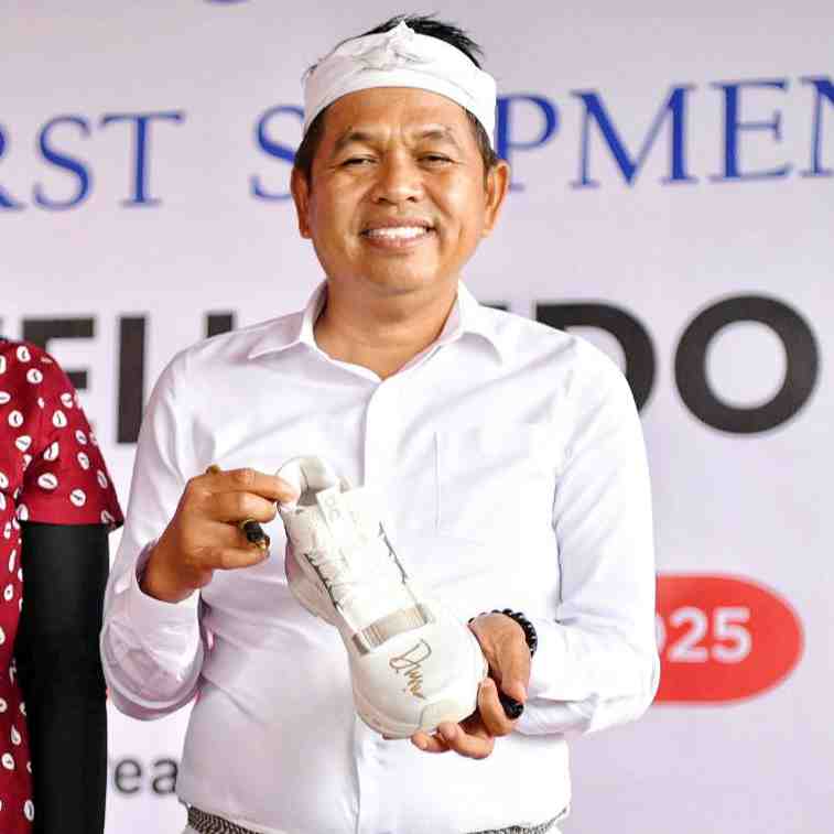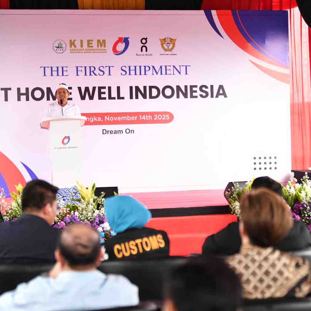 KABUPATEN MAJALENGKA - Gubernur Jawa Barat Dedi Mulyadi melepas ekspor perdana sepatu On Cloud Running produksi PT Home Well Indonesia di Kawasan Industri KIEM, Kabupaten Majalengka, Jumat (14/11/2025...